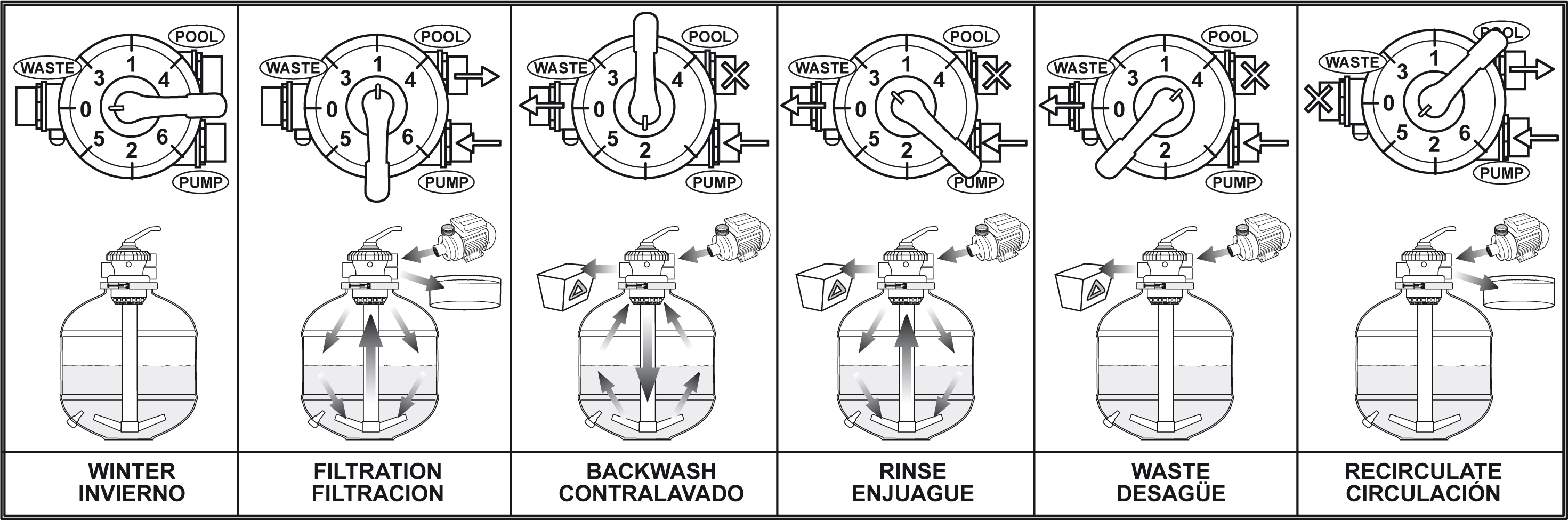 A continuación, se describen las distintas fases y funciones de un filtro de arena para piscinas desmontables: