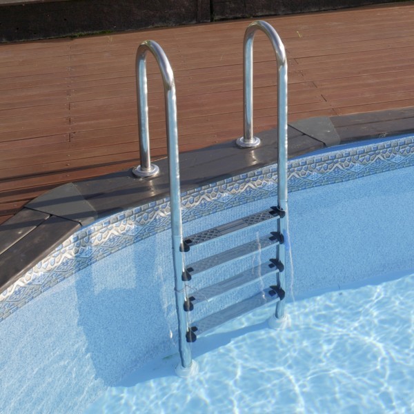 Estas escaleras están fabricadas en acero galvanizado. Son resistentes y fáciles de mover cuando lo necesitemos. El tratamiento de galvanizado aplicado al acero evita la corrosión en las barras que están en contacto constante con el agua, lo que aumenta su durabilidad. Los peldaños tienen una superficie antideslizante, y las partes que tocan el interior de la piscina están cubiertas con un material suave para proteger al liner de posibles roturas.